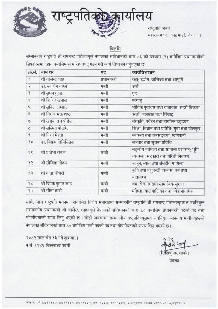 १३ चैत- काठमाडौं, बालेन्द्र शाह नेतृत्वको मन्त्रिपरिषद्को सूची राष्ट्रपति कार्यालयले सार्वजनिक गरिएको छ ।
